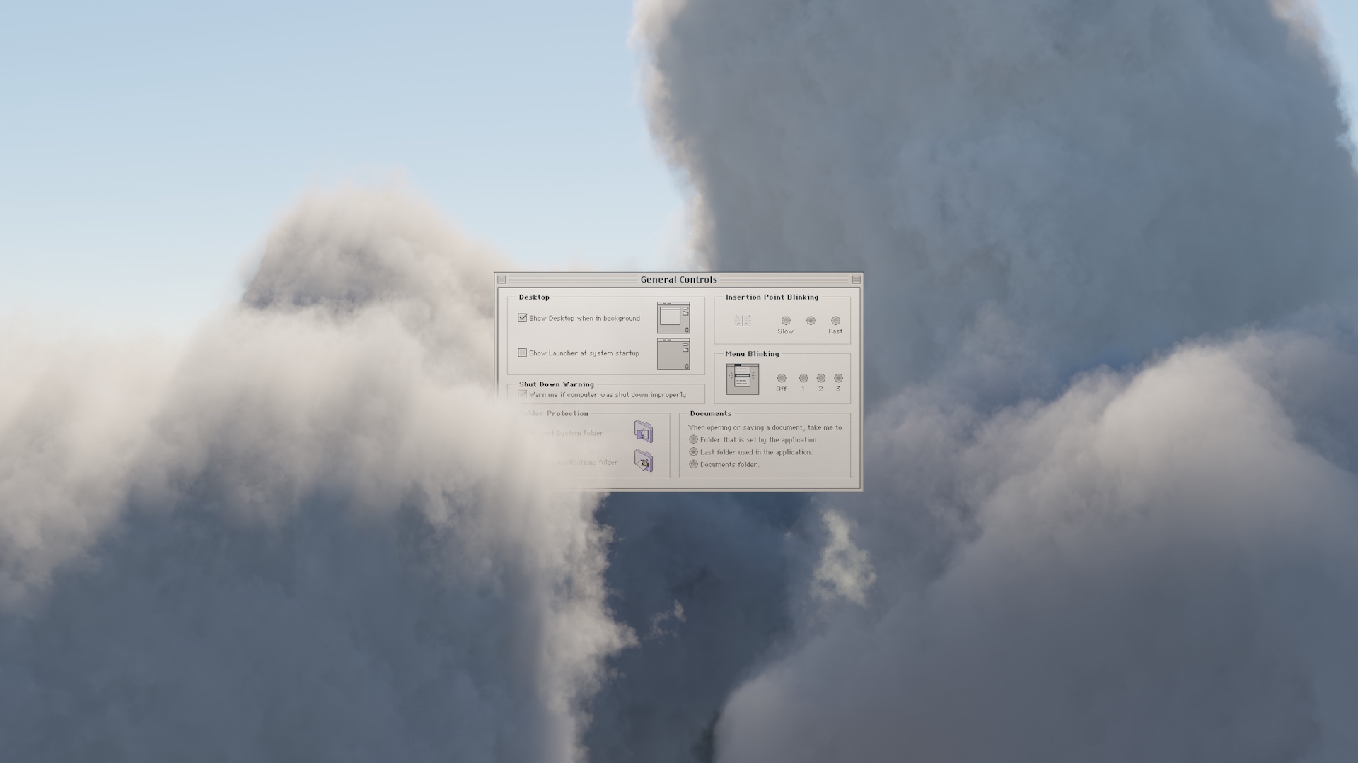 This is the Mac OS 8 General Controls preferences window, painstakingly interpreted voxel-for-pixel and lovingly rendered in a synthetic cloudscape. Here is a 1920 by 1080 sample image.
